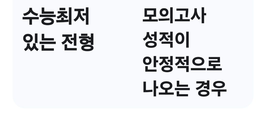 반대로 모의고사 성적이 잘 나오는 학생이라면 논술 전형이나 수능 최저학력기준이 높은 전형을 적극적으로 활용해야 합니다.