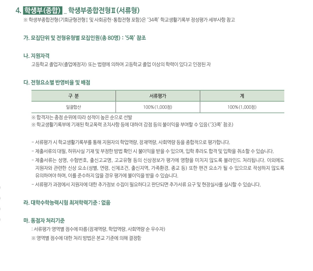 • 학생부종합Ⅱ(서류형)은 서류평가 100%만으로 80명을 선발합니다.