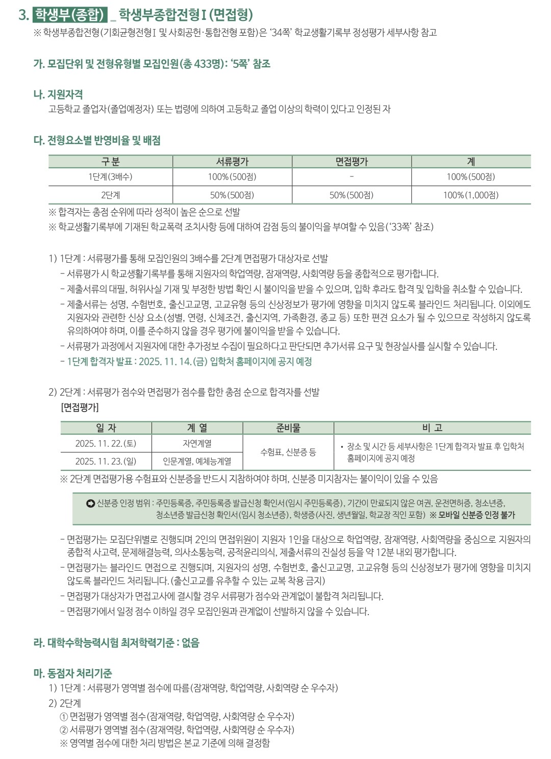 서류평가(1단계)로 3배수를 선발한 뒤, 서류 50% + 면접 50%로 최종 합격자를 가립니다. 면접은 지원자의 학업 역량, 잠재 역량, 사회 역량 등을 종합적으로 확인하는 과정입니다.