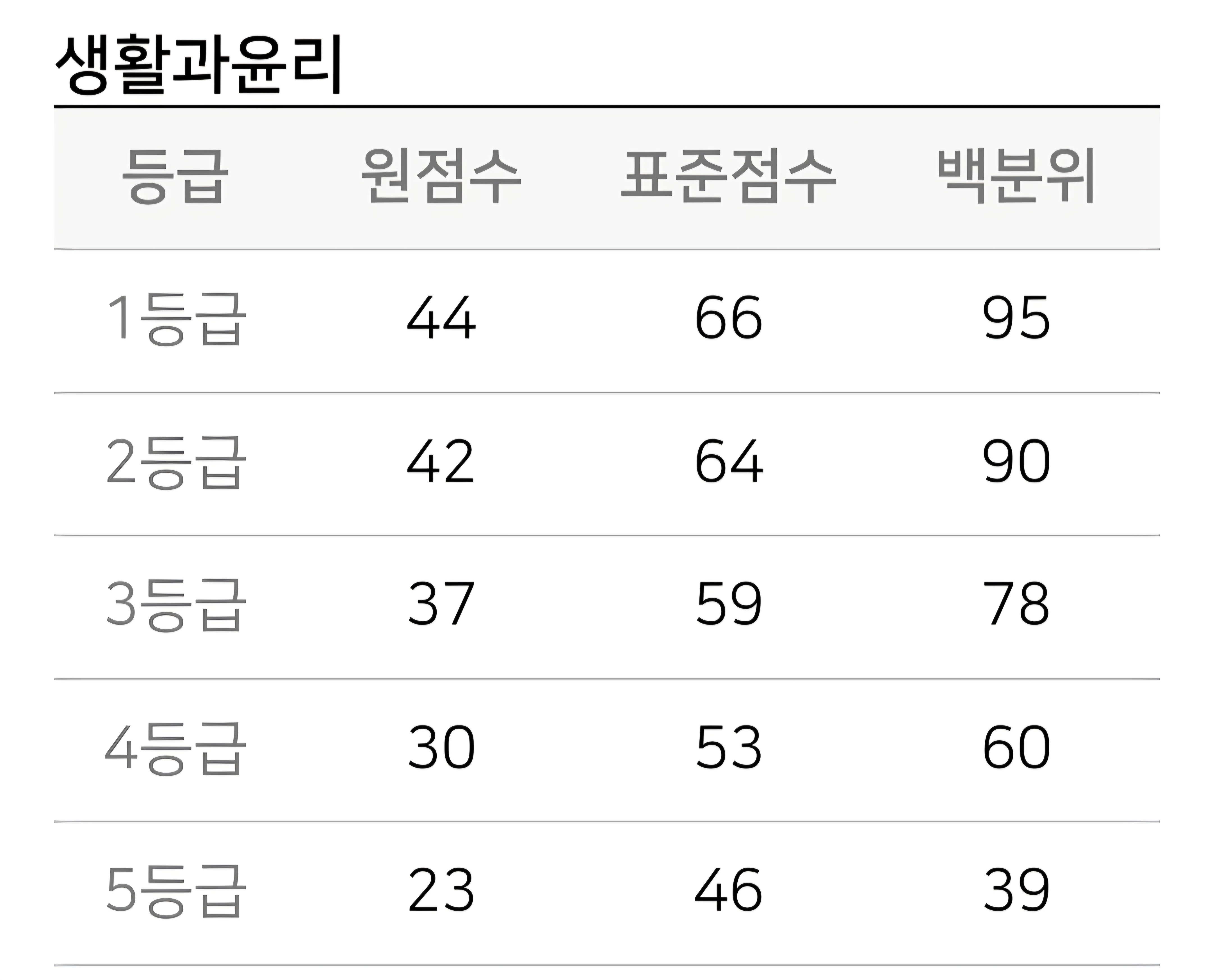 • 과학탐구 최고점: 생명과학Ⅰ(74점)이 가장 높았으며, 지구과학Ⅰ, 물리학Ⅱ(68점)가 가장 낮아 6점 차이가 발생했습니다.